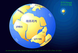 태평양이 밑으로 가라앉은 것은 대륙의 땅 덩어리를 위로 밀었다. 지금 오스트랄리아, 남북 아메리카, 남극 대륙으로 부르는 땅 덩어리들과 함께, 유럽과 아프리카가 태평양에서 솟아오르기 시작했다. 이 기간의 끝에, 지구 껍질의 1/3이 땅이었고, 모두가 하나의 대륙이었다.