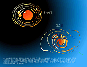 이 태양 가스의 기둥은 나중에 태양계의 12 행성으로 진화했다. 반대 쪽에서 분출된 것은 운석으로 응축되었고, 상당 부분은 태양 인력에 다시 붙잡혔다.